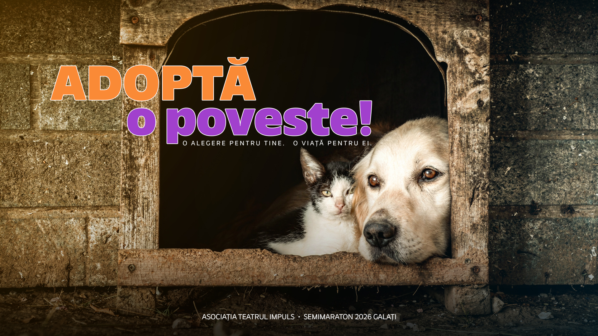 Galațiul are adăposturi pline și prea puține adopții. Organizăm 3 reprezentații de teatru-lectură (aprox. 200 participanți) inspirate din povești reale ale animalelor care își așteaptă o familie. Publicul va afla cazuri concrete și va putea intra direct în legătură cu voluntarii. Transformăm emoția în acțiune, cu un obiectiv clar: minimum 4 adopții responsabile generate prin proiect. Prin teatru transformăm o poveste într-o întâlnire reală și emoția într-o decizie concretă.